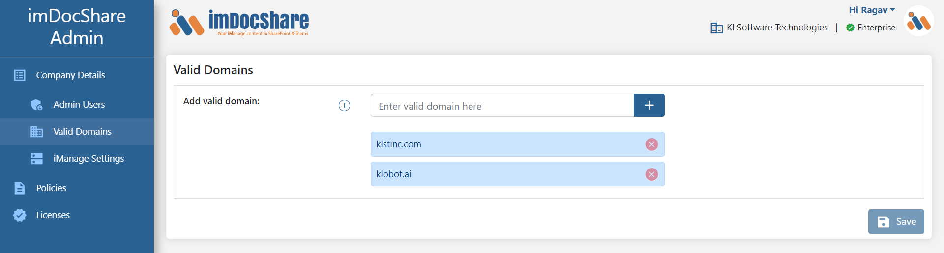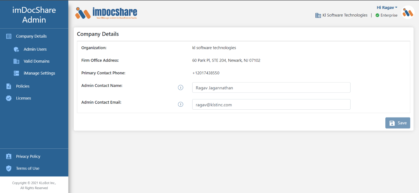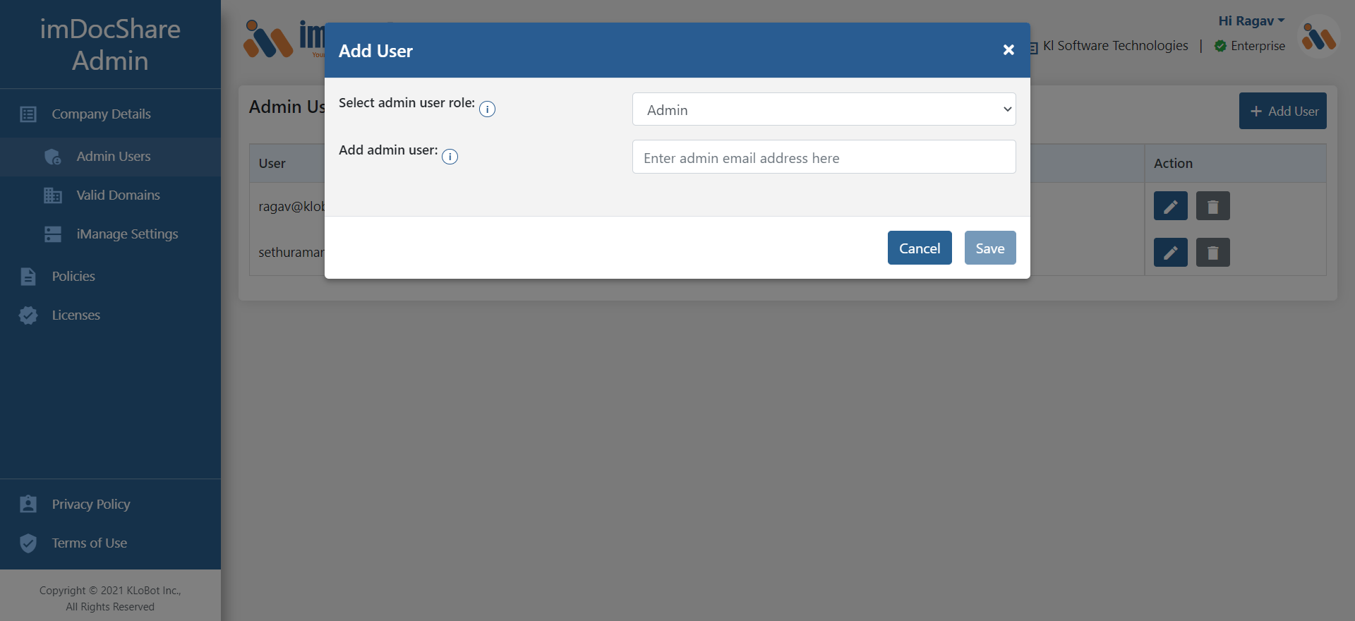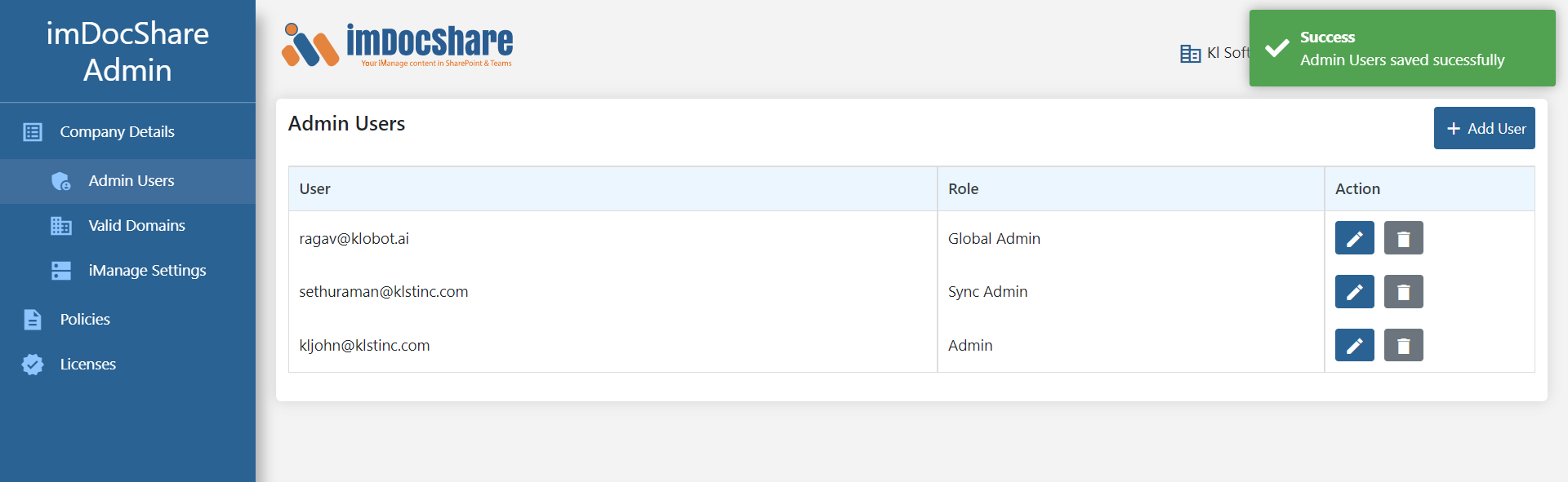 imDocShare Admins can use this Admin App. Admins are automatically set to primary contact user emails when a client creates an account with our company. Admins are also able to manage this list to add or remove User emails. Navigate to Admin Users page and add a valid User’s Email ID or remove them and click “Save”.