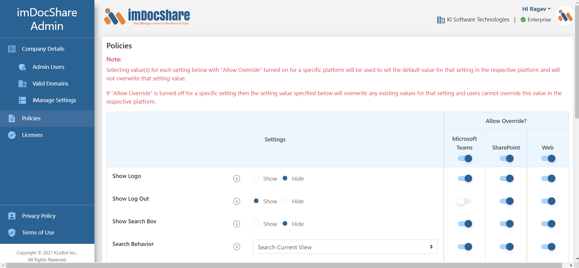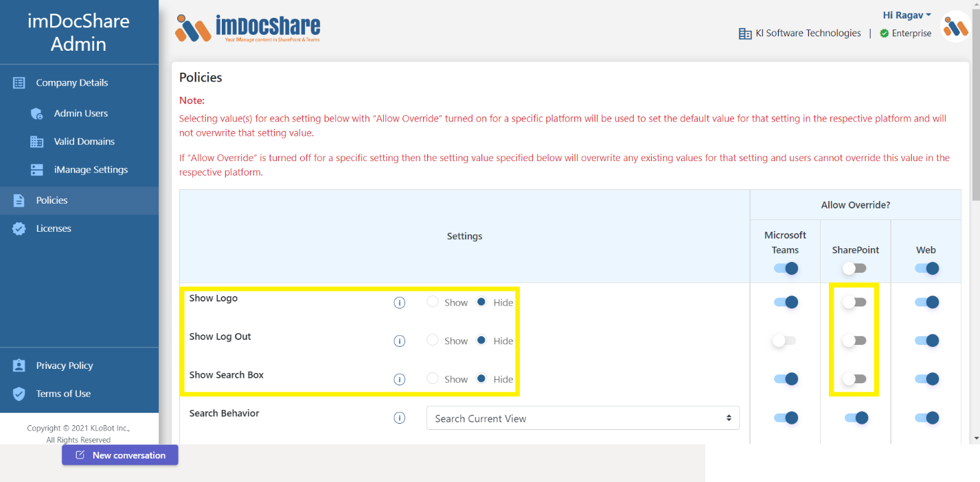 In the example below, we have disabled override options for some settings which will restrict users from overriding in SharePoint. We have disabled Show Logo, Show Logout and Show Search Box with the pre-defined settings.