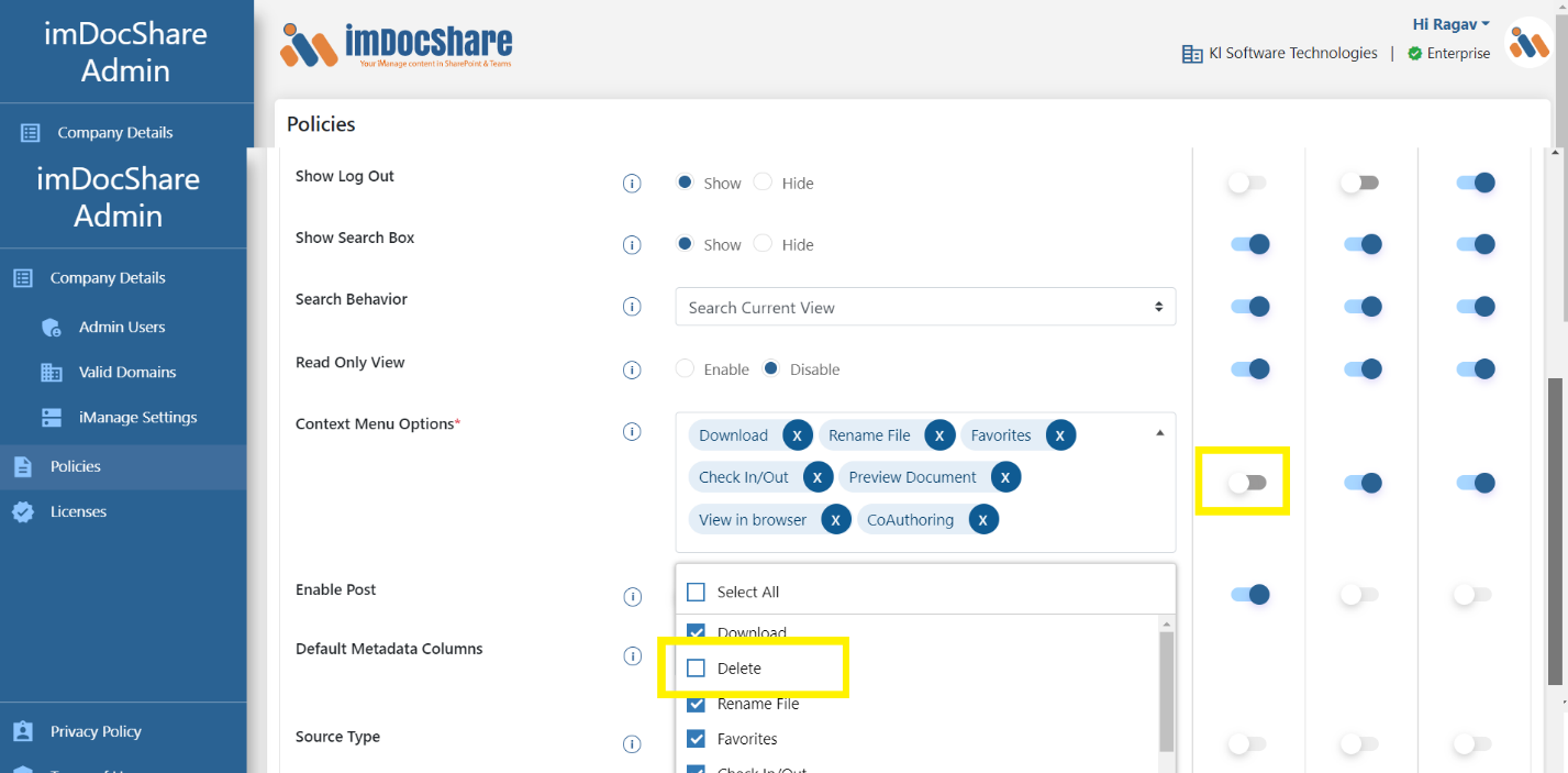 Default Metadata Columns: Admin users have the ability to restrict column properties’ metadata values based on the requirement.