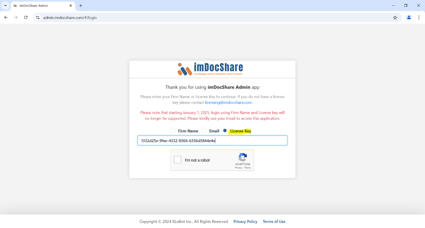 After entering the License key, it will start validation. From the version 1.2.0 Admin Users are also able to login using the firm name. Once that is successfully completed, it will allow the User to authenticate with iManage.
